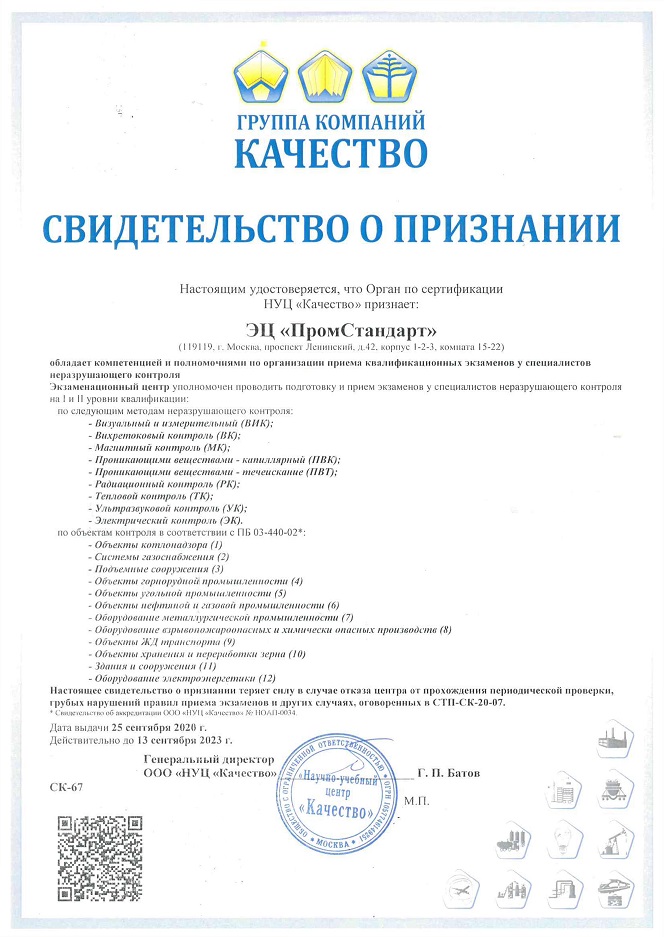 Экзаменационный центр «ПромСтандарт» - это организованный экзаменационный центр по подготовке и приему квалификационных экзаменов у специалистов в области неразрушающего контроля в соответствии с требованиями, указанными в СДАНК-02-2020 «Правила аттестации персонала в области неразрушающего контроля».