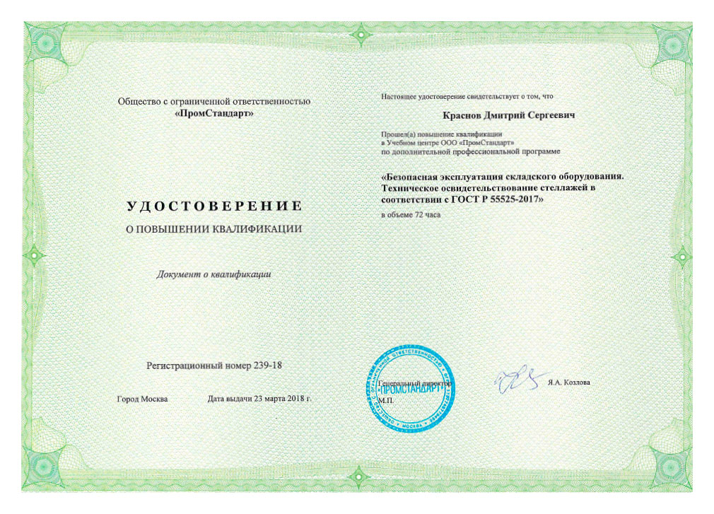 Учебный Центр «ПРОМСТАНДАРТ» предлагает пройти обучение всем организациям, эксплуатирующим стеллажи, а также специалистам испытательных лабораторий, проводящих техническое освидетельствование.