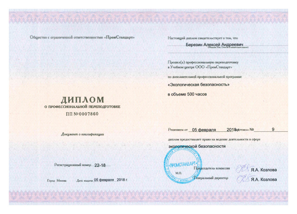 Слушатели, успешно освоившие программу обучения, получают диплом о профессиональной переподготовке, дающий право дающий право профессиональной деятельности в области экологии.