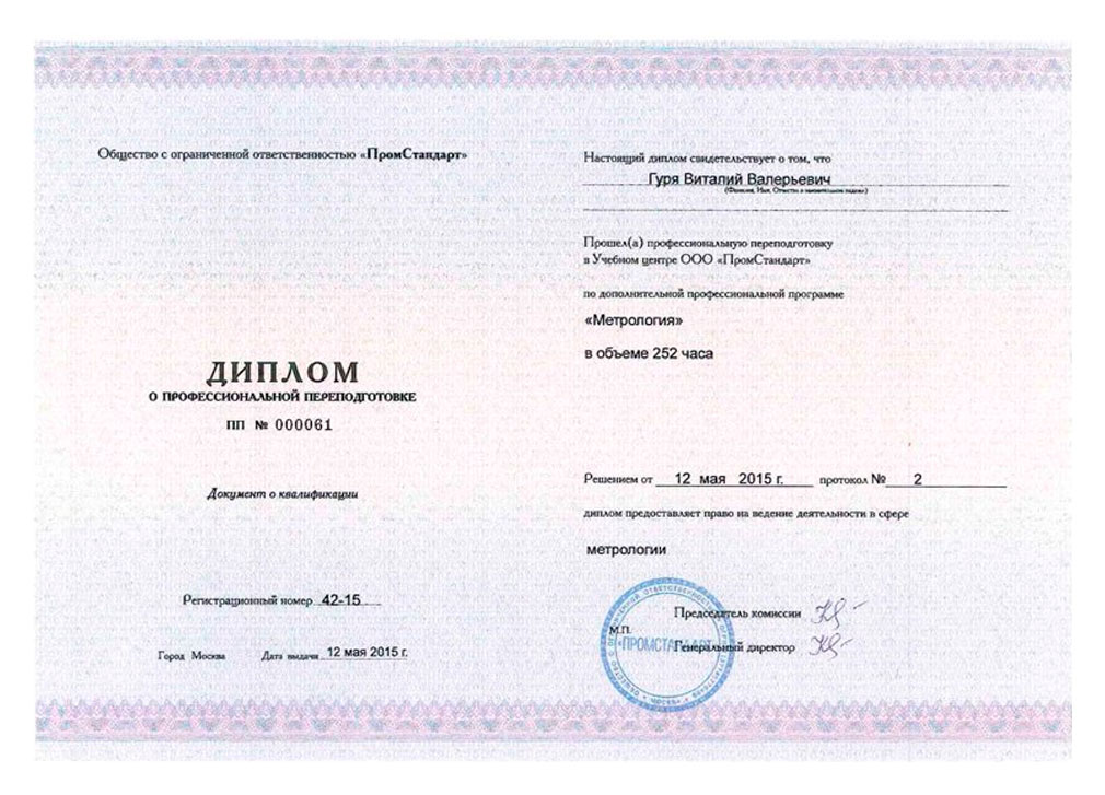 По результатам профессиональной переподготовки выдается диплом о профессиональной переподготовке установленного образца, дающей право выполнения работ в области метрологии.