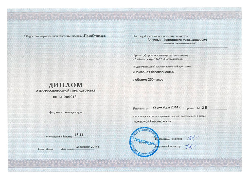 Слушатели, успешно освоившие программу обучения, получают диплом о профессиональной переподготовке, дающий право профессиональной деятельности в области пожарной безопасности.
