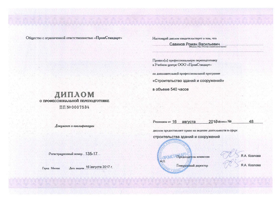 Слушатели, успешно освоившие программу обучения, получают диплом о профессиональной переподготовке, дающий право дающий право профессиональной деятельности в области строительства.